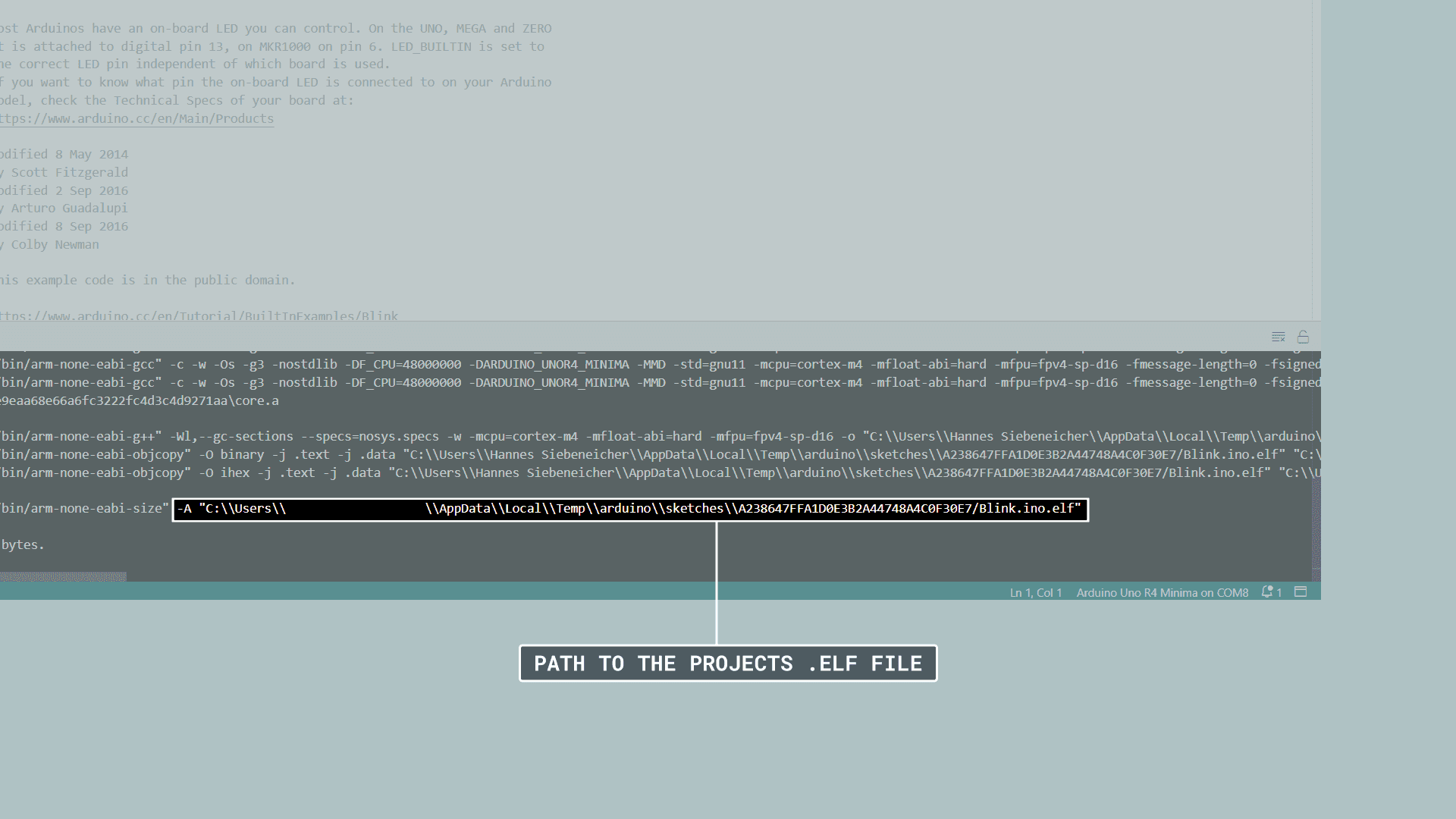 .ELF file will be saved. Build your project in the Arduino IDE and highlight the output directory; it should look for example like C:\Users\profile\AppData\Local\Temp\arduino_build_815037. Note down the path for easier access in the next step.