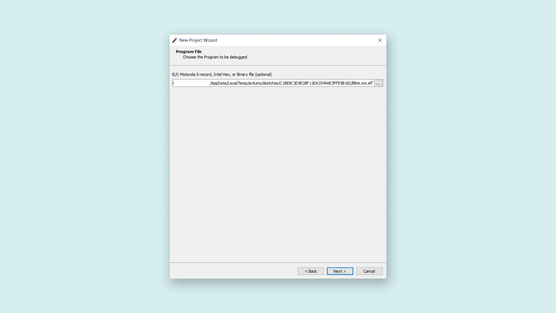 .ELF file with the temporary output path that we noted before. Navigate to the correct directory, and select the .ELF file.In the 'optional settings' dialog, set both options 'Initial PC' and 'Initial Stack Pointer' to 'Do not set' as it would skip the Arduino bootloader, otherwise this may prevent the sketch from running correctly.