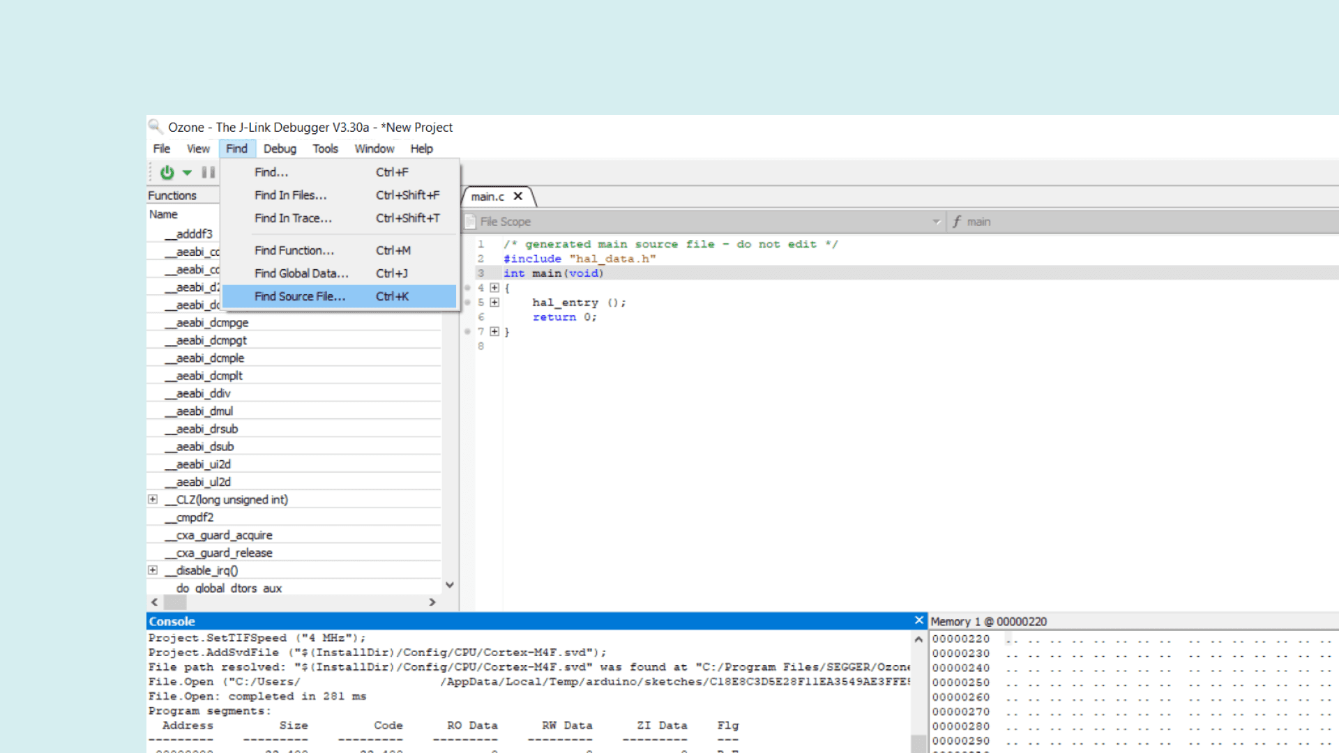 When the setup is finished, Ozone will open the file containing the main function. You will note that this is not the .ino sketch you wrote since this is an abstraction layer generated by the IDE. To open our .ino sketch we need to go to Find > Find source file in the top toolbar.