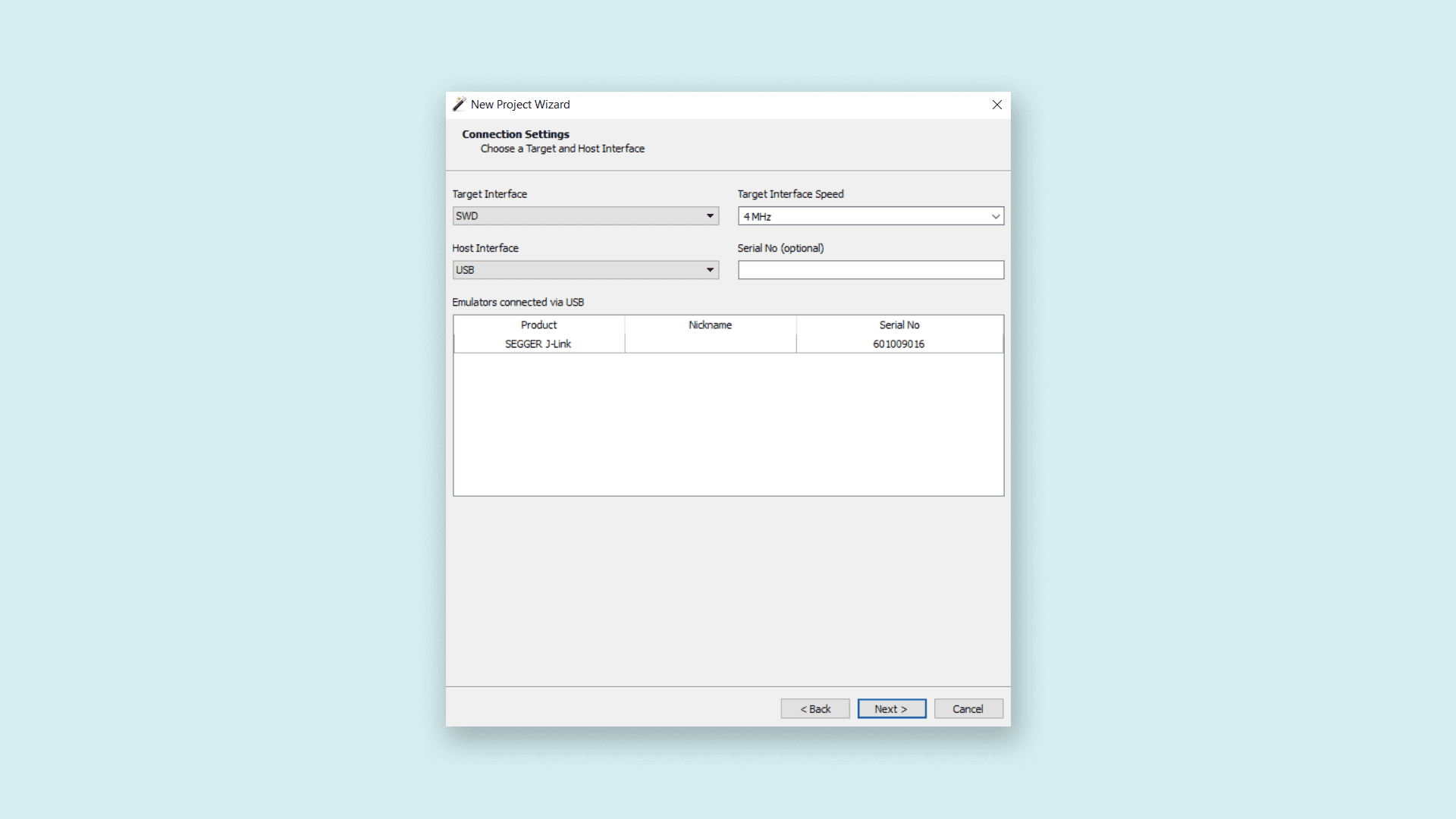 Continue to the next step. Here you need to change the Target Interface to SWD. Then select your J-Link device in the list of emulators and head to the next page.
