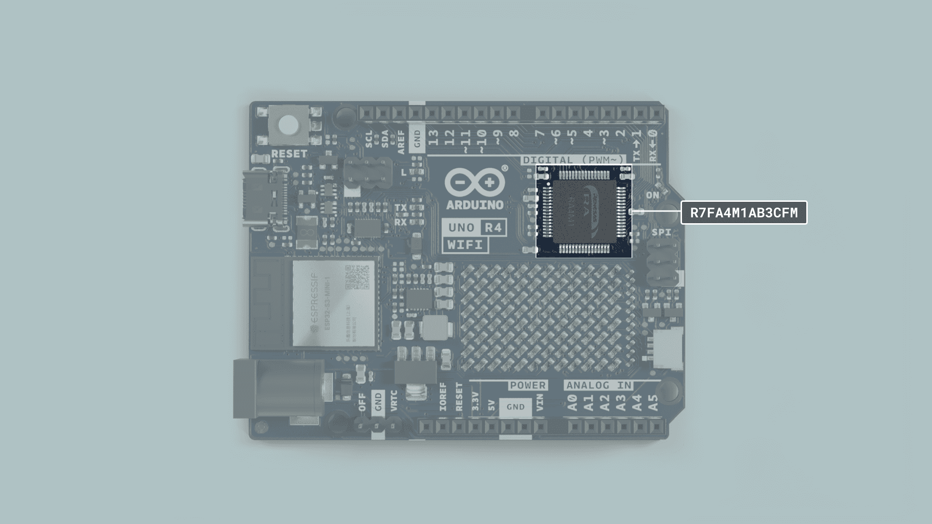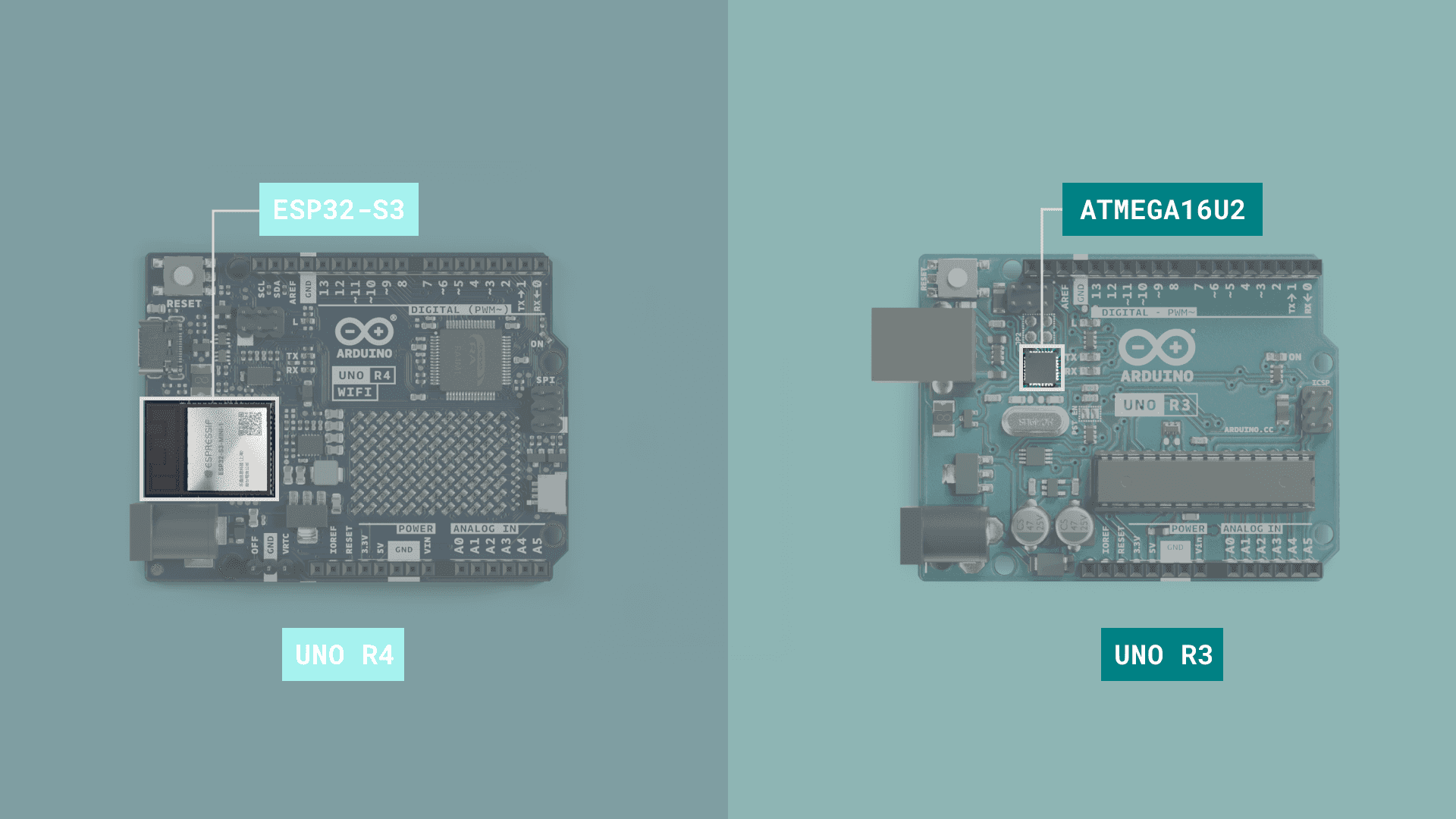 On the UNO R3, the ATMEGA16U2 serves the same purpose. The onboard ESP32 module is a more advanced SoC, adding Wi-Fi® & Bluetooth® connectivity to the board.