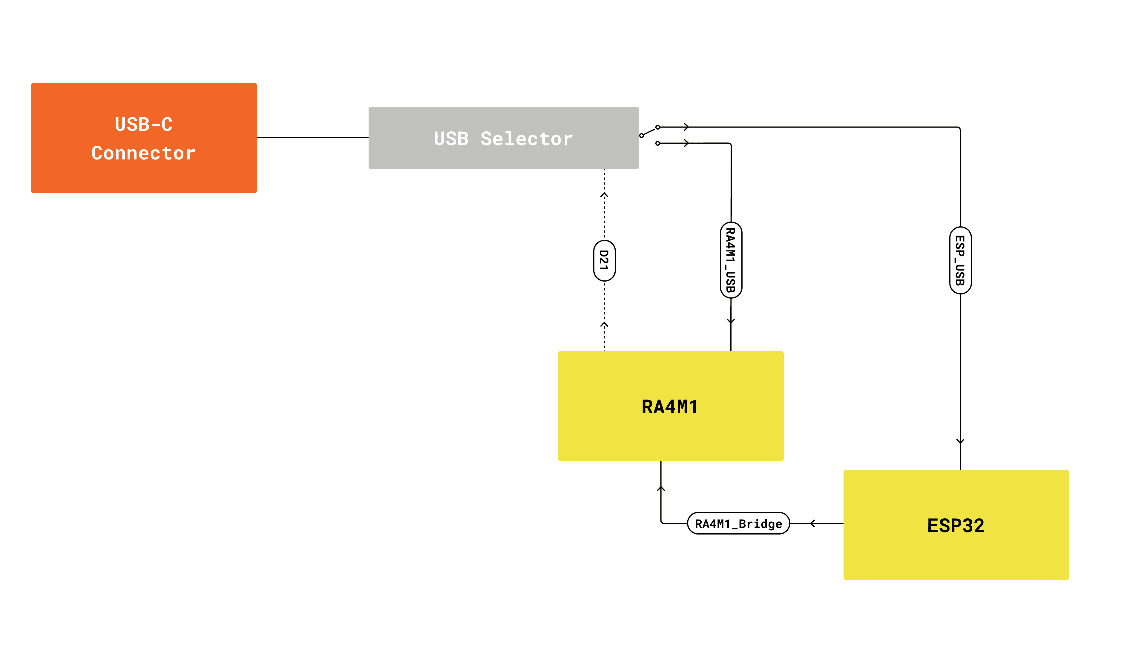 By default the ESP32 acts as a serial bridge between a computer and the RA4M1 MCU. The USB data lines are routed through switches, and by default, these switches are set for communication to go via the ESP32 module.