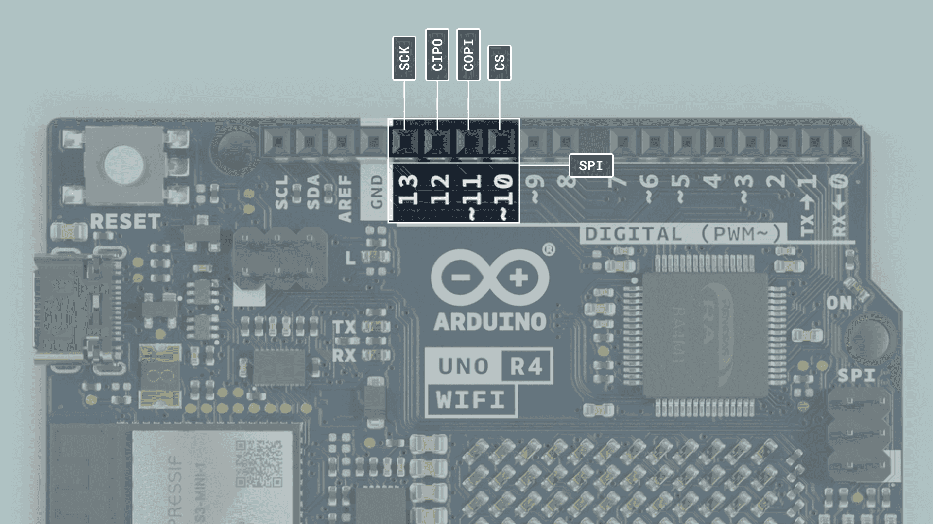 | D11 | Digital | SPI (COPI), GPIO pin, PWM |