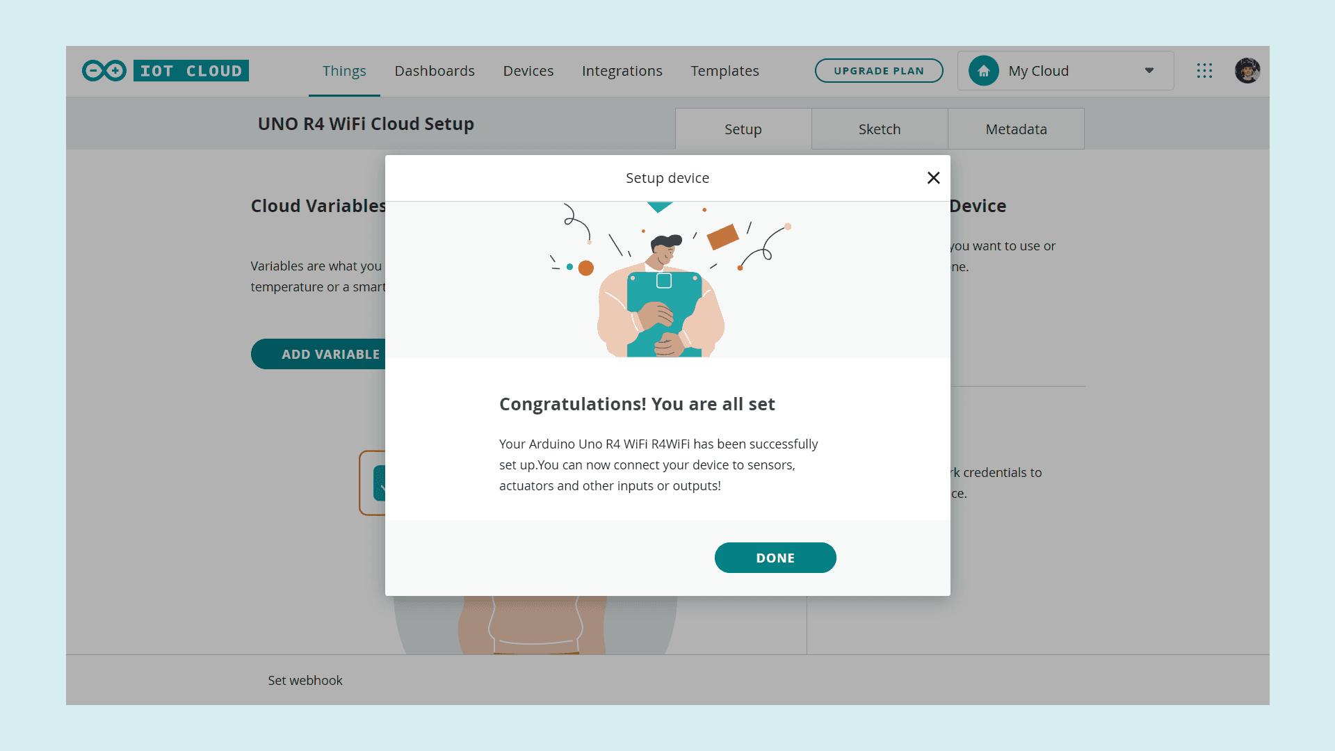 You have now successfully set up your UNO R4 WiFi to work with the IoT Cloud. To get started with your first IoT project, check out our Getting Started With the Arduino Cloud guide.