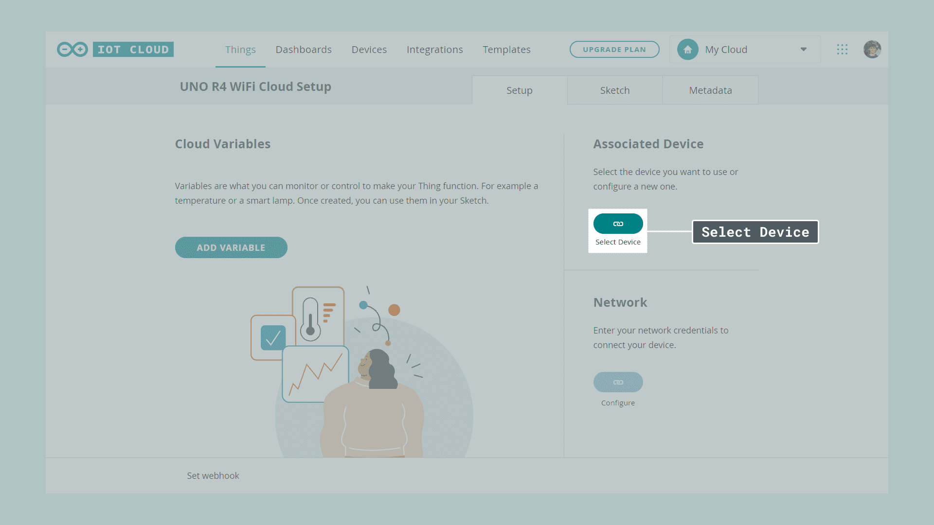 This will take you to the setup menu for creating your Thing. Here you can set up your device, configure your network connection and add Cloud variables. You can learn more about Cloud variables in Getting Started With the Arduino Cloud. First, under associate device, click on Select Device.
