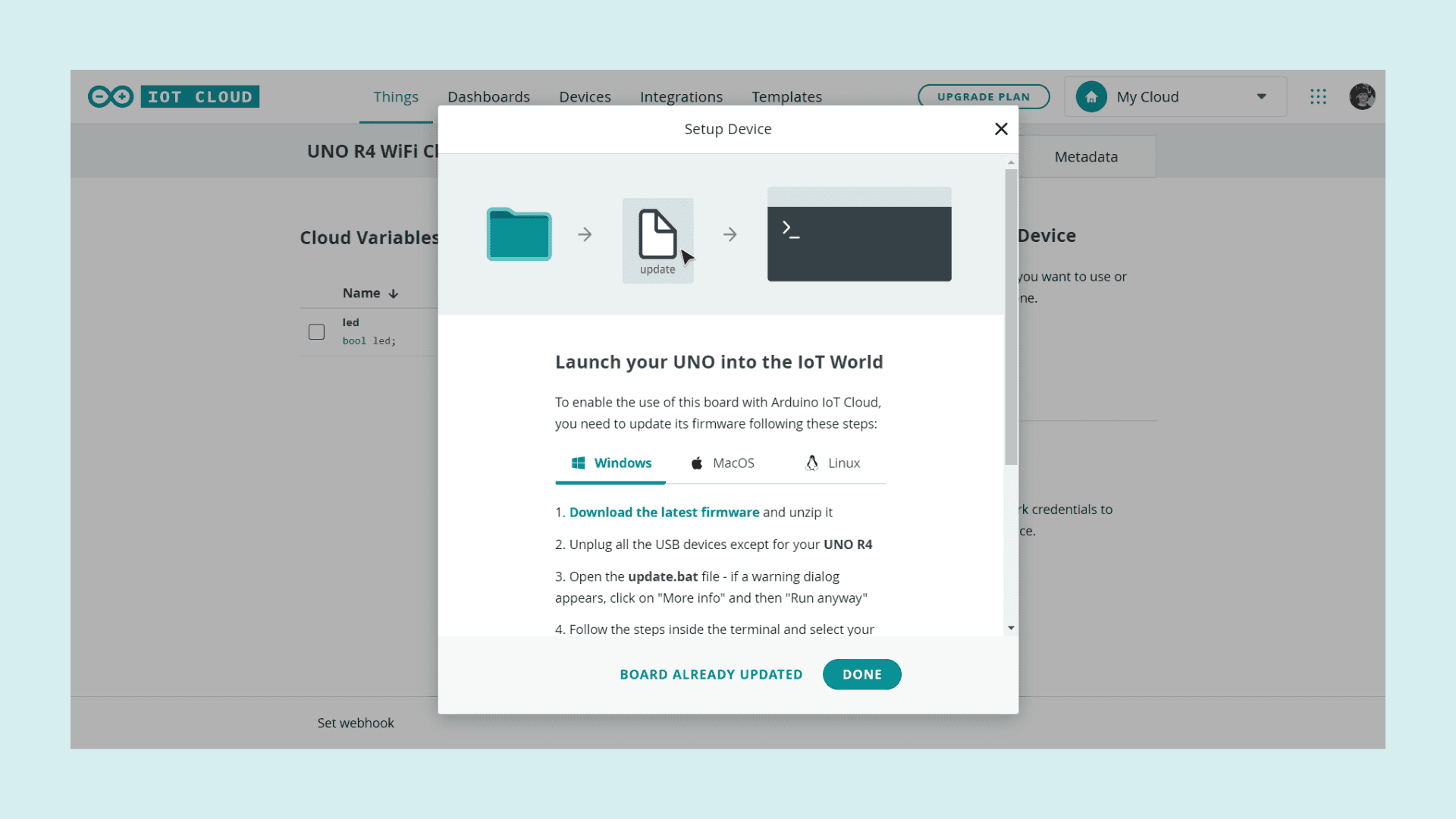 Arduino UNO R4 WiFi IoT Cloud Setup Guide