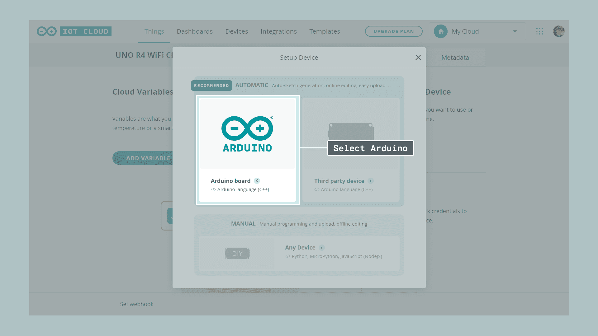 A step-by-step guide on how to set up the UNO R4 WiFi with the Arduino Cloud.