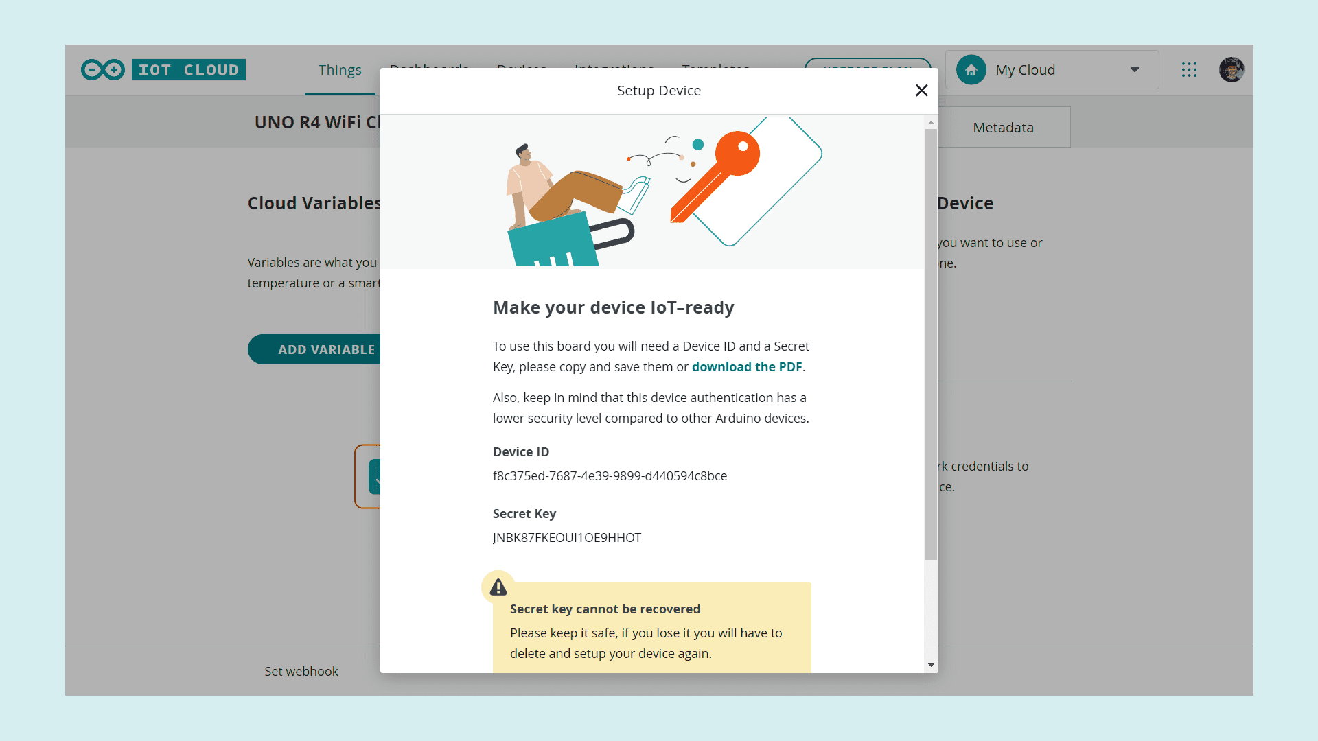 Choose a name for your board and press next. The next parts need a little bit more attention. Because the UNO R4 WiFi doesn't have a crypto chip it needs a secret key that works as an identifier, guaranteeing a safe connection. That secret key is shown to you in the next step and you can either download a pdf containing all the information you need to save or copy and paste the secret key and the device ID someplace where you won't lose it.
