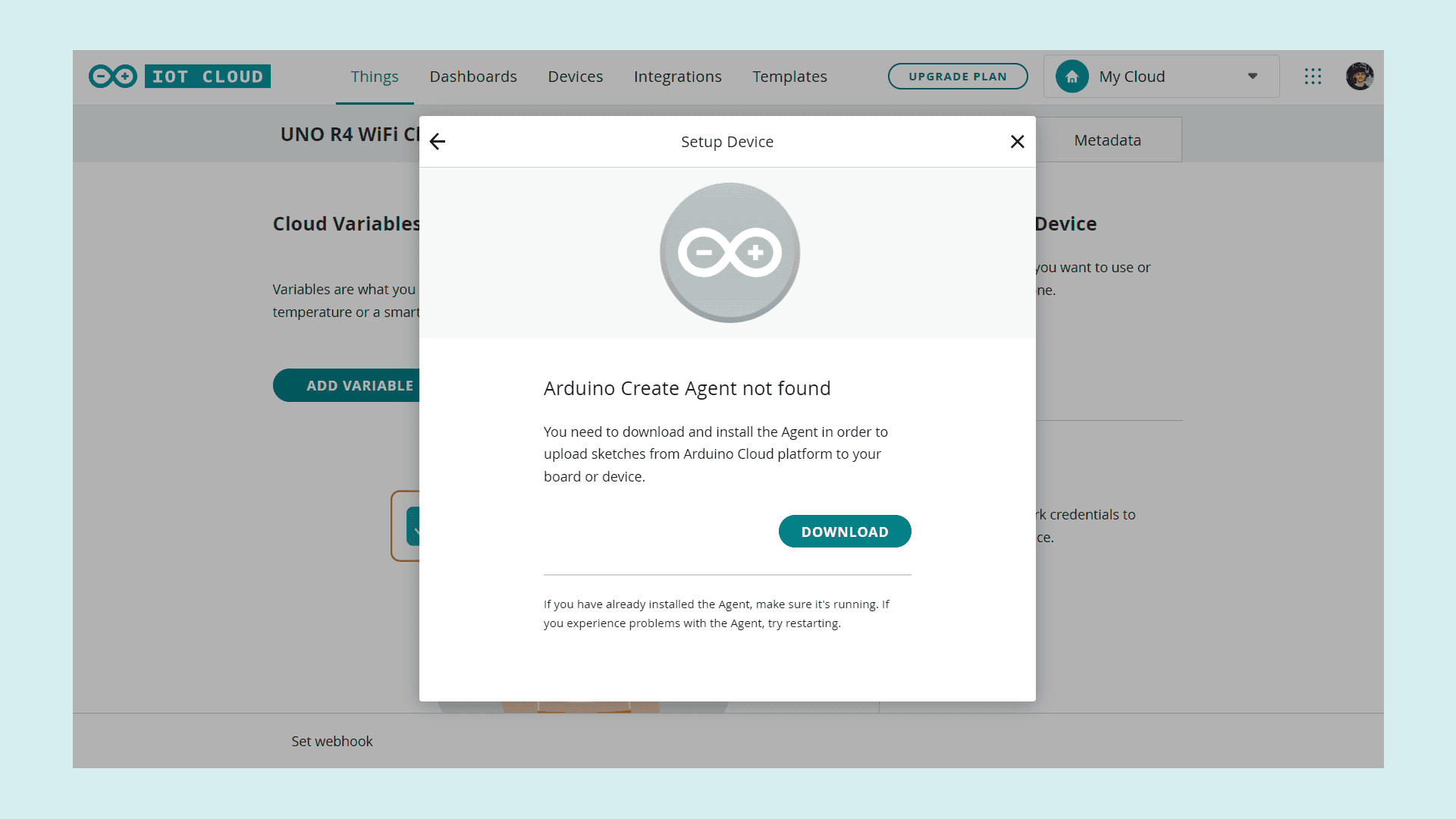If this is your first time using the Arduino Cloud you will be asked to download the Arduino Create Agent. The Create Agent is a piece of software that is necessary for your Arduino board to communicate with your browser. Download and install it by clicking on download and following the installation process.
