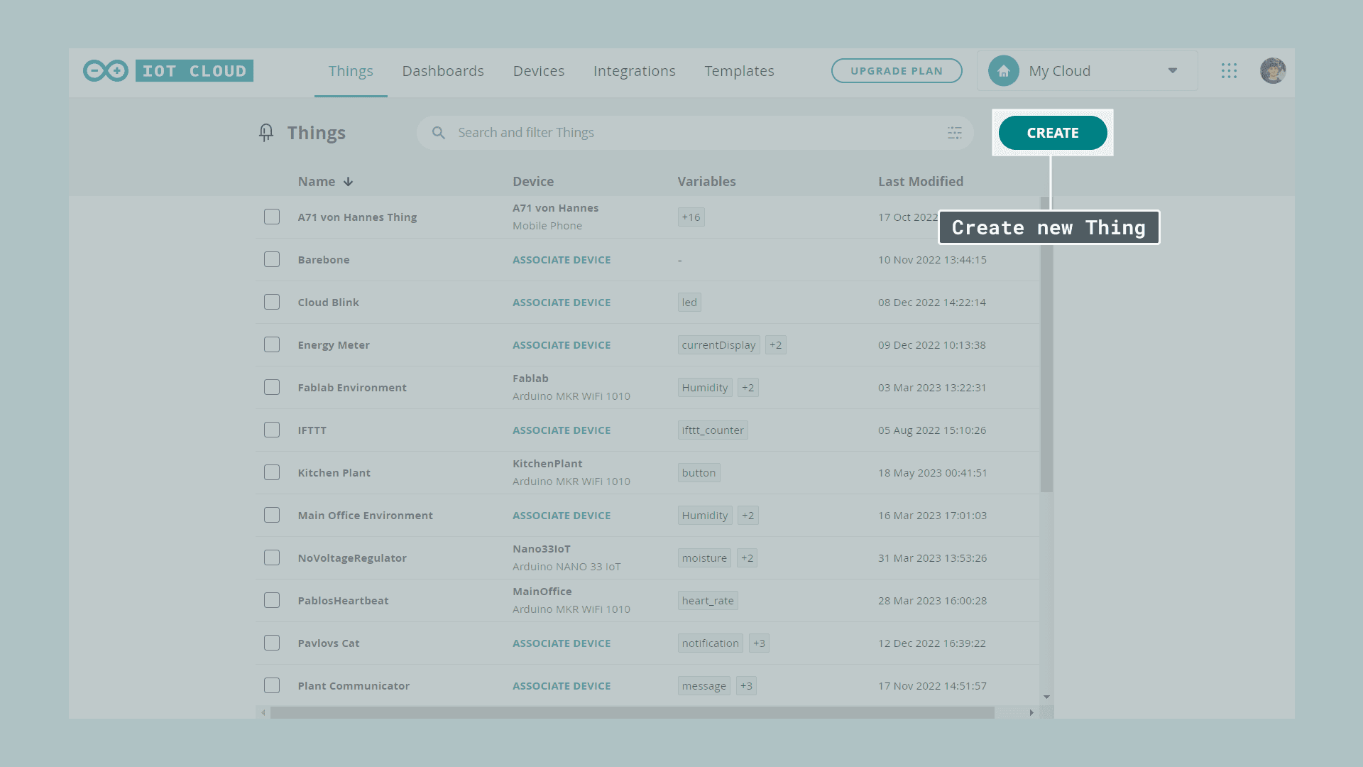 After you have set up your account you can connect your board to your pc. Inside the IoT Cloud Things overview click on Create.
