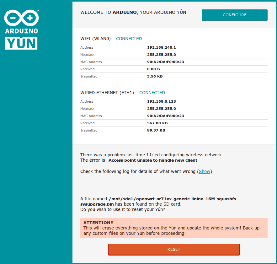 If you want to proceed resetting the Yún, click the red RESET button at the very bottom of the page.