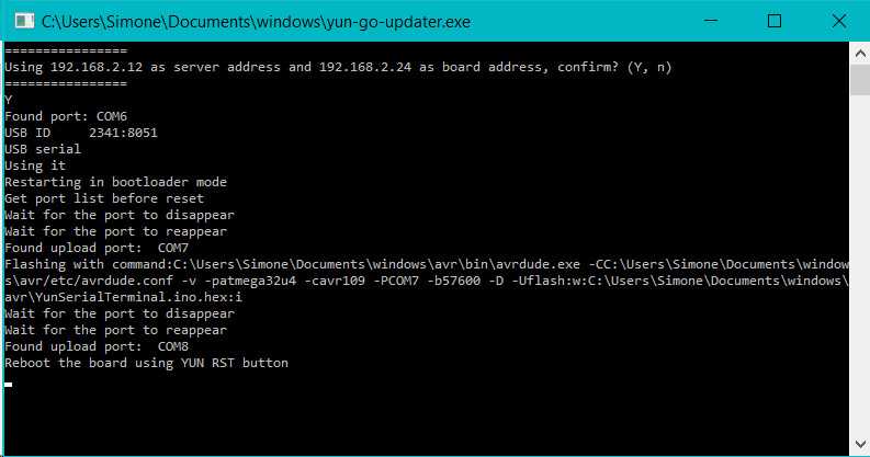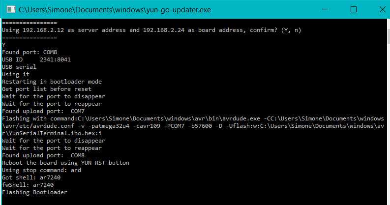 This procedure tries to bring your Yún board to the latest firmware, no matter how old it is. To achieve that, it goes through a series of passages and procedures that try to avoid at 99.999% the chance of bricking the board. It has been designed with our best effort to avoid you any trouble, nevertheless there is a remote chance of making the board unusable and therefore we can't assume the responsibility for that. The bootloader will be reflashed and this CAN BRICK your board if something unpredictable happens. This should be considered an advanced procedure, pay attention to the warnings throughout. You should read and understand this document before trying anything mentioned below.