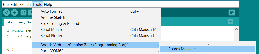 The Board Manager available in the Arduino Software (IDE) allows you to find and download the Board Packages available for our and third party boards. To update the Zero Board Package, you need to choose Tools > Board > Boards Manager...