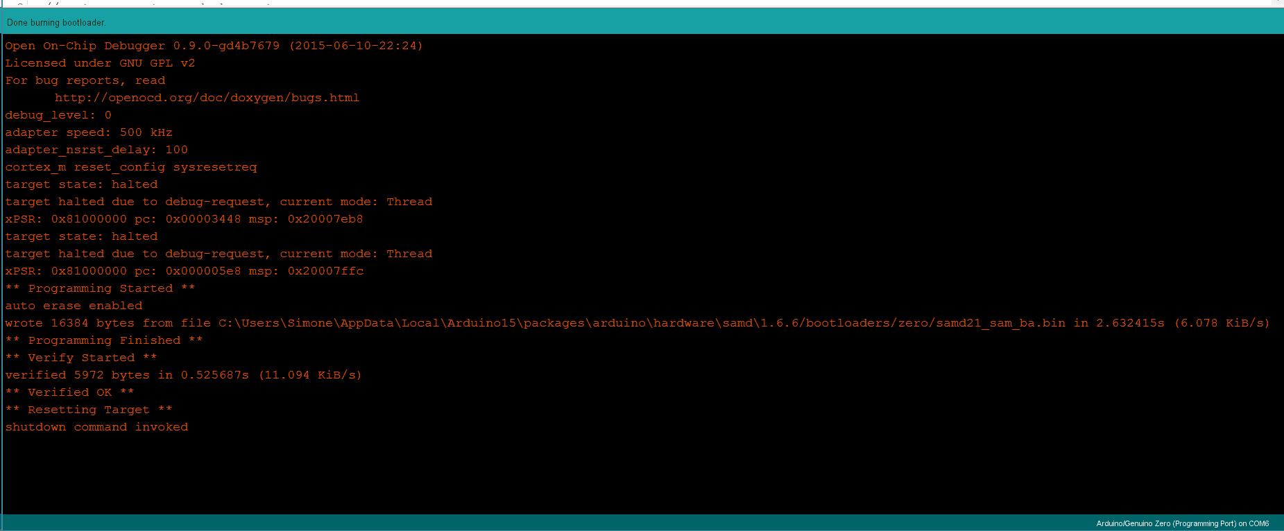 Congratulations! You have successfully updated the bootloader on your Arduino Zero. It is possible to do this because of the Atmel EDBG chip on the board.