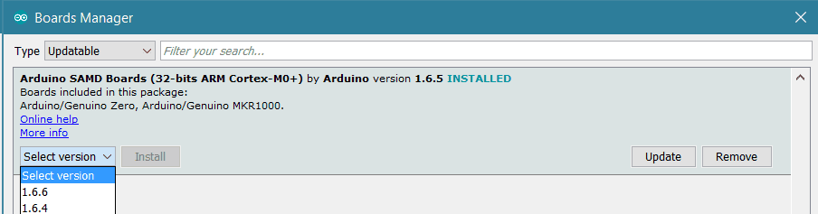 The Boards Manager window will open up and initiate the update process for the available Board Packages. When you gain access to the interface, please select Type > Updatable and look for Arduino SAMD in the list. If an update is available it will show up, otherwise you may check if you have the most recent version searching directly for SAMD.